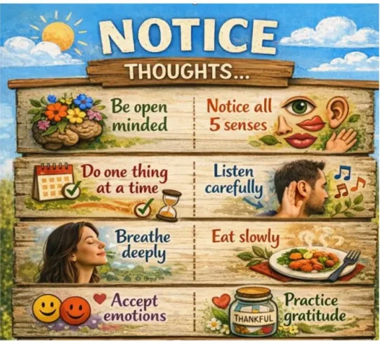 Sit quietly, breathe deeply, and focus on the present moment—whether it’s the rhythm of your breath, sounds around you, or how your body feels.